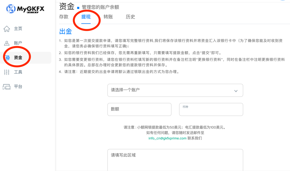 二:选择自己的账户,输入要出金的金额(最低50美金,最后一次清仓除外)